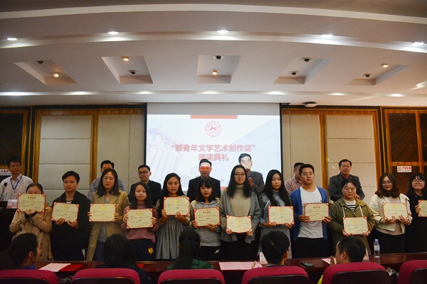 岳凯华宣读“新青年文学艺术创作奖”的获奖名单,与会领导、嘉宾为获奖同学颁发证书。“新青年文学艺术创作奖”获奖代表屈子正发表感言。