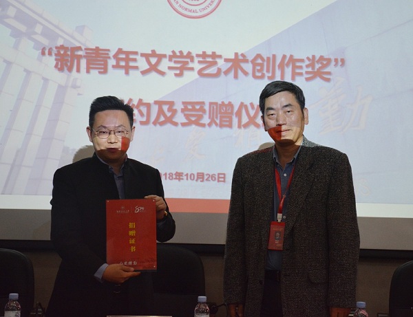 仪式伊始,熊剑峰简要介绍了捐赠方梁振华及其所设立“新青年文学艺术创作奖”的情况。梁振华与公司经理郑贤章签订捐赠协议,黎大志代表公司接受了捐赠支票,并为梁振华颁发捐赠证书。
