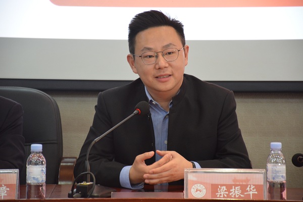 黎大志代表公司感谢梁振华为校庆献礼,并为梁振华点赞,他指出此次捐赠是对广大青年学子们的一次激励,鼓舞学子们热爱文学,追求艺术,首开风气,意义非凡。最后,他表达了对公司及公司未来发展的美好祝愿。