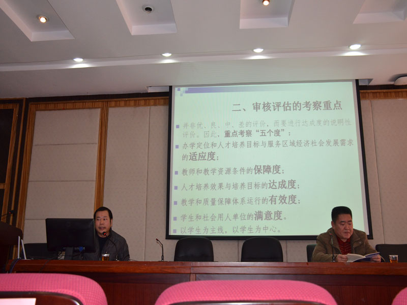 教学副经理岳凯华利用PPT结合知识手册文本解读了《本科教学工作审核评估知识手册》的内容。他就审核评估的概念、考查重点、专家进校考察的内容与形式以及本院办学定位和专业培养目标等重要内容带领教师们进行了深入学习。