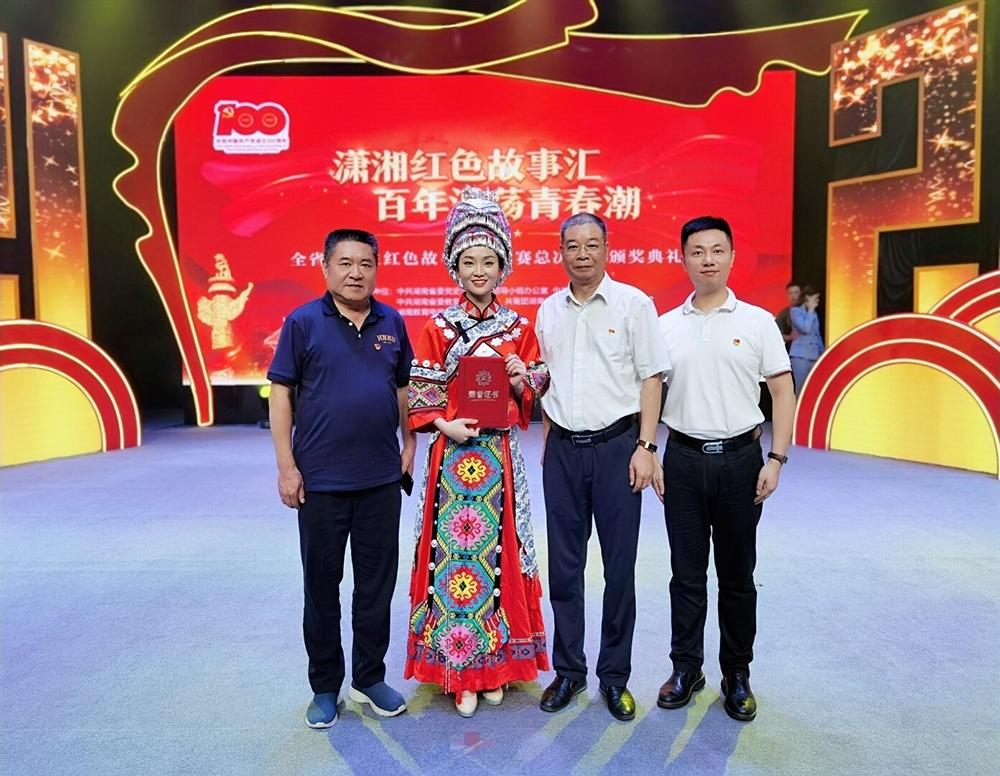 比赛现场,参赛选手们以湖湘革命先辈、开国将帅、英雄模范和在百年党史历程中具有重大影响的历史事件为基本素材,紧扣红色主题,从自身独特视角出发,讲述红色故事。公司beat365手机版官网入口硕士研究生江静雪第一位出场,以《一首湘西民歌的家国情》为题,深情讲述了湘西土家民歌《马桑树儿搭灯台》背后集思想性、故事性、教育性于一体的红色故事,生动诠释了在百年党史中中国共产党员的初心使命与家国情怀,感动了在场所有评委与观众,最终荣获全省最高奖。