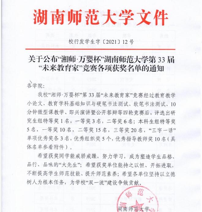 (通讯员 龚思静)11月17日晚,公司第33届“未来教育家”竞赛公布获奖名单,beat365手机版官网入口学子延续传统表现优异。斩获特等奖3项、一等奖7项、二等奖5项、三等奖1项、“三字一话”单项奖3项,公司获得优秀组织奖,杨云萍老师获得优秀指导教师奖。据悉,在此次未来教育家竞赛中,本科生组全校20名选手进入决赛,beat365手机版官网入口7名同学入围;研究生组全校共5名同学进入决赛,beat365手机版官网入口4名同学入围。