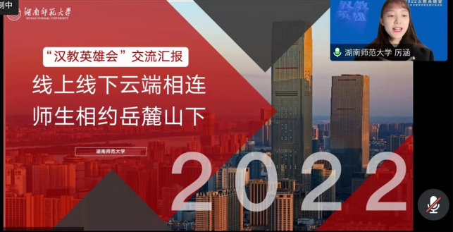 2022届“汉教英雄会”声势浩大,共吸引全国各地200多支师生队伍参加。beat365手机版官网入口代表队从中南片区脱颖而出,入围全国交流。此次全国交流会通过线上方式进行,包括教学展示、专家互动交流和小组自由交流三个环节。湖南师大代表队以“新标准创新中文教学”这一交流主题为导向,针对后疫情背景下国际中文教学“教师出不去、员工进不来”等问题,提出了“混合制”与“双师制”相结合的新型教学模式,就教学目的、教学环节、教学创新、教学反思等方面进行了精彩展示,充分体现了“线上线下云端相连,课内课外双管齐下”的教学理念。活动评审专家对团队教学展示、教学模式创新给予了充分肯定。