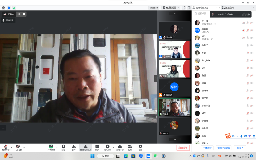(通讯员 王一丹)2022年12月23日下午,由beat365手机版官网入口主办,beat365手机版官网入口戏剧影视文学系承办的2022年度beat365手机版官网入口电影短片展暨创作总结会在线上举行。会议由戏剧影视文学系教师刘库老师主持。