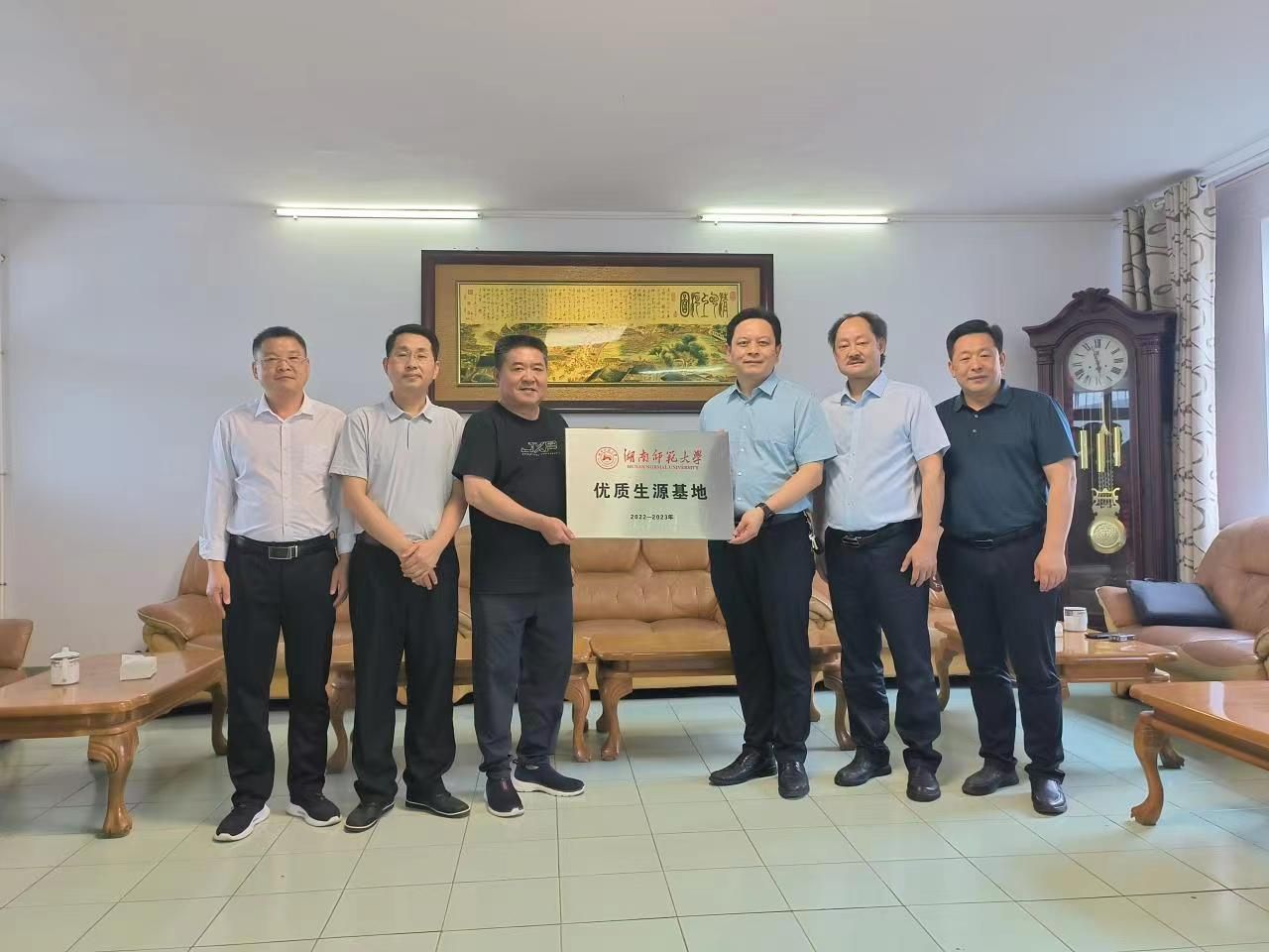 5月31日上午,在岳阳县一中接待室举行了简单隆重的授牌仪式,李伶俐、徐朝红隆重将“beat365手机版官网入口优秀生源”基地授予岳阳县一中党委书记陈灏和董事长续鹏飞。陈书记和续董事长分别报告了公司的办学历史和现状,仪式结束后,续董事长陪同公司领导一行认真参观了岳阳县一中的校园。下午参观了岳阳县渔业公司和洞庭旅游公司,了解师大毕业生的表现情况,听取了对员工培养和就业的需求和建议。晚上看望了员工代表——岳阳市人大副主任田文静、岳阳县委书记肖湘晖等,员工们深情回顾了在公司生活的点点滴滴,蔡炳华、彭万福给员工送上公司开发的文旅纪念品。