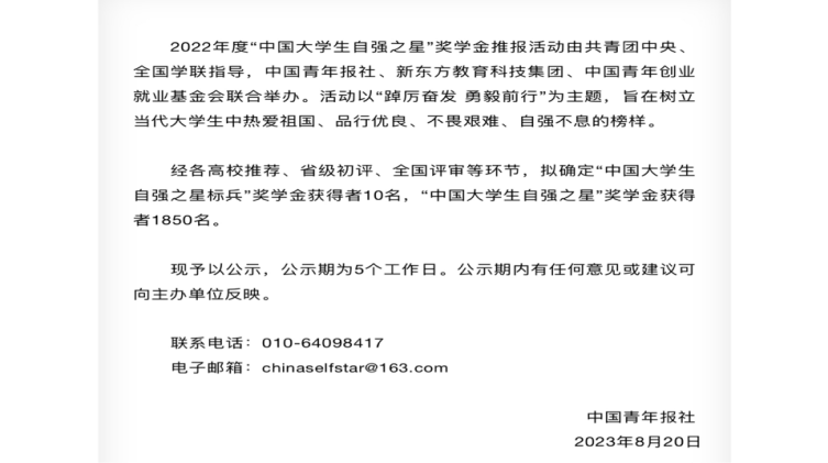 (通讯员 田昊彤)8月20日,由共青团中央、全国学联指导,中国青年报社、新东方教育科技集团、中国青年创业就业基金会联合举办的2022年度“中国老员工自强之星”奖学金推报活动公示获奖名单。公司2019级汉语言文学(基地)班熊雨涵获此称号,受公示表彰。
