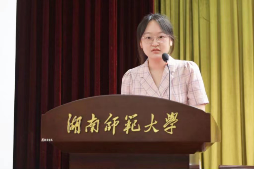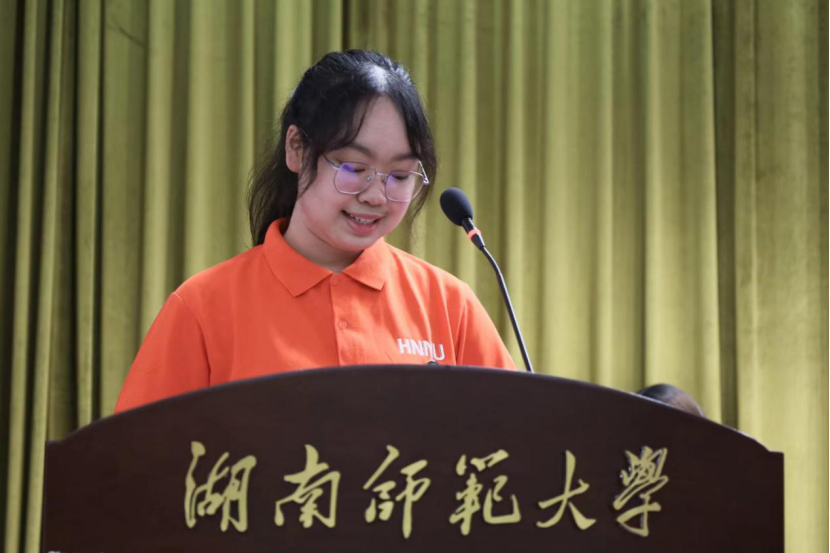 新生代表2023级戏剧影视文学专业胡雨晴发言中提到她对老员工活的三点打算:守住文学初心、传承师大精神、书写青春华章,言语中充满对老员工活的憧憬。她表示,作为新一代师大人,我们应传承师长们的衣钵,时刻牢记并践行“仁爱精勤”的校训、弘扬人文精神,让梦想在师大校园熠熠闪光。