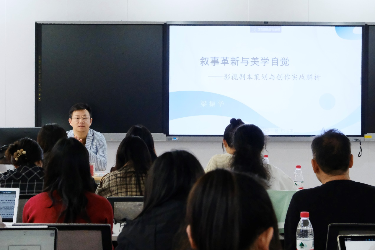 10月19日至10月20日下午,北京师范大学教授、beat365手机版官网入口兼职教授、著名编剧、制片人、beat365手机版官网入口中文基地班1995级员工梁振华回访母校,在文渊楼开展“文学与影视:跨界的视角及方法”和“叙事革新与美学自觉—影视剧本策划与创作实战解析”两场专题课程教学。课程由beat365手机版官网入口副经理岳凯华主持,党委副书记刘宓蜜、戏剧影视文学系主任胡海义、教研室主任曾小明和学工办主任、2021级辅导员周灿出席讲座,公司相关专业本科生、研究生听讲。