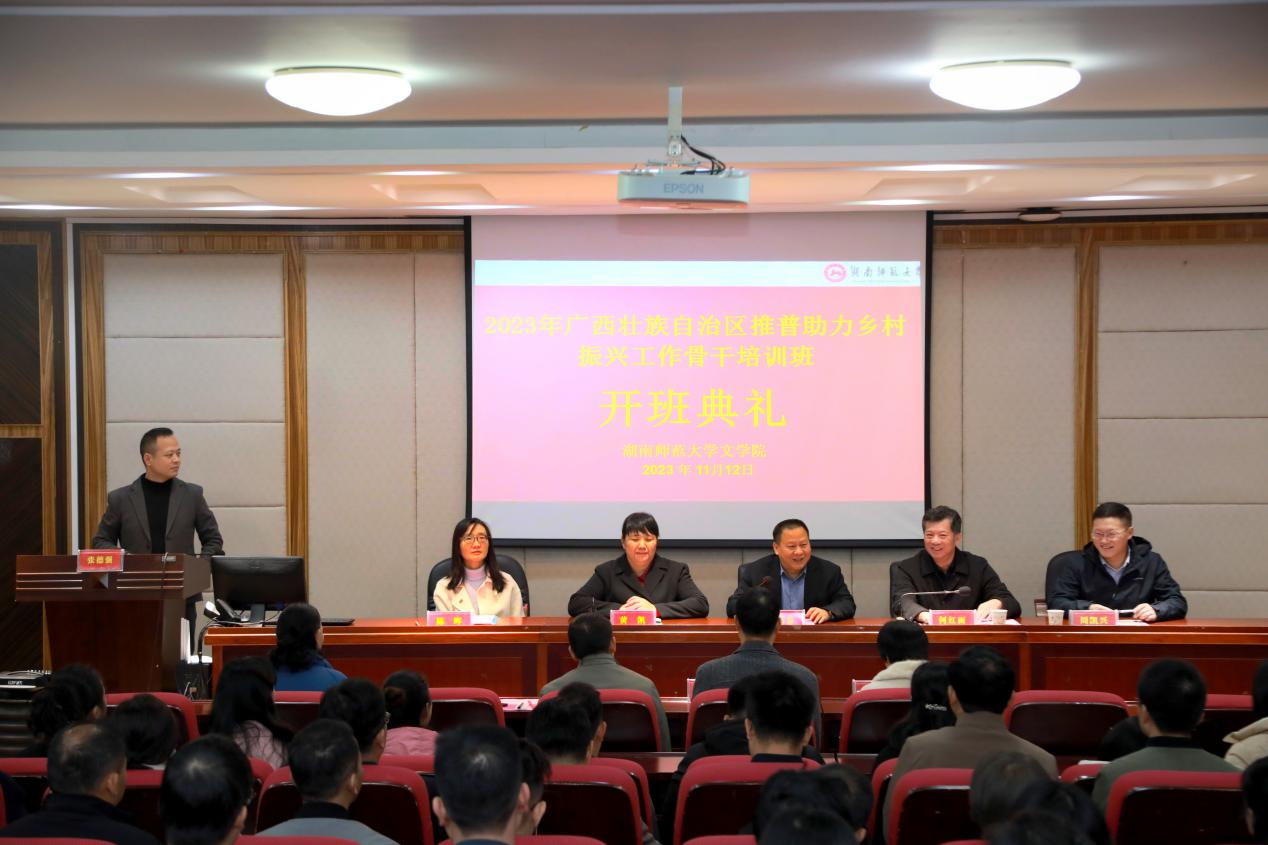 (通讯员:李妍佳 王婧之)11月12日,2023年广西壮族自治区推普助力乡村振兴工作骨干培训班在公司举行。自治区教育厅语工处处长黄凯、四级调研员韦方奇,beat365手机版官网入口经理肖百容、副经理周凯兴、对外汉语系主任陈晖,桂林师范高等专科公司副董事长何红雨、教务处处长石群山,以及80名学员参加了开班仪式。开班仪式由院成教办主任张德强主持。