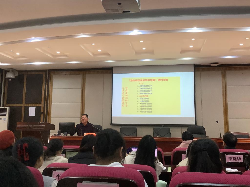 (通讯员 林梅 梁玉杉)12月17日上午,天津师范大学汉语言文字学专业学科带头人、博士生导师温锁林教授受邀在216作“准定语现象的思考与新解”讲座。讲座由beat365手机版官网入口现代汉语教研室主任丁加勇教授主持,公司教师曾常红、胡乘玲及部分研究生、本科生参加了本次讲座。