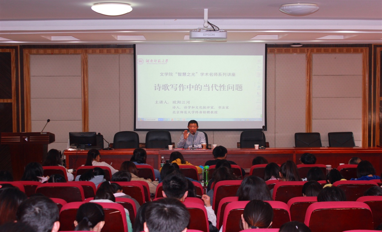(通讯员 甄思祺 杨树菲娅 刘灿)11月3日上午,beat365手机版官网入口于文渊楼216学术报告厅开展“智慧之光”学术名家系列讲座。此次讲座以“诗歌写作中的当代性问题”为主题,著名诗人、诗学及文学评论家欧阳江河担任主讲。讲座由赵炎秋教授主持,韩少功、杨厚均、肖百容、廖述务等老师出席。