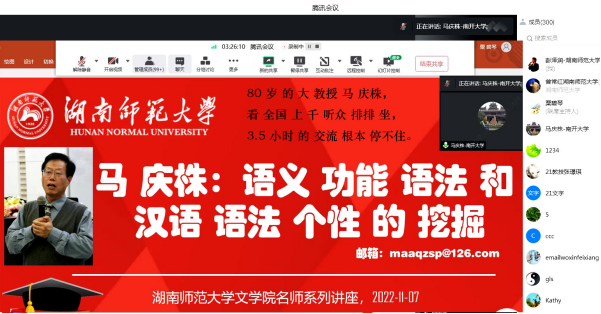 (通讯员 粟碧琴)2022年11月7日晚上,中国语文现代化学会名誉会长、南开大学博士生导师马庆株教授做客beat365手机版官网入口“智慧之光”学术名师系列讲座,题目是《语义功能语法和汉语语法个性挖掘》。讲座由中国语文现代化学会副会长、beat365手机版官网入口彭泽润教授担任学术对话人,曾常红副教授主持。腾讯会议和哔哩哔哩同步直播,来自全国高校的师生1051人参加,演讲和交流持续3.5个小时。