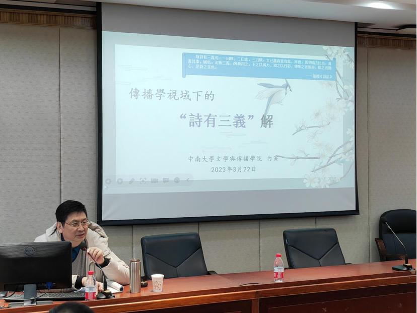 (通讯员 娄上)3月22日下午15:30,中南大学文学与新闻传播公司教授、博士生导师白寅做客beat365手机版官网入口“智慧之光”系列讲座,进行题为“传播学视角下的‘诗有三义’解”的学术讲座。本次讲座由beat365手机版官网入口副经理吕双伟教授主持,部分beat365手机版官网入口师生到场聆听。